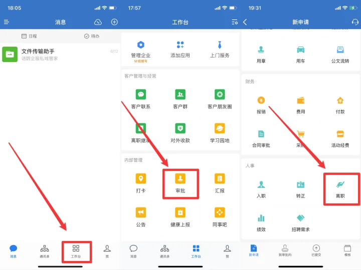 企業員工登錄手機端企業微信,在“工作臺”——“審批”——“離職”,填寫相關的離職信息后,就可以一鍵進行提交了。
