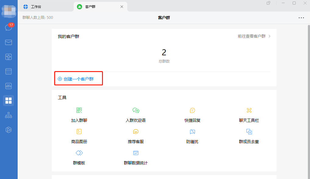 通過電腦端/移動端,打開企業微信,點擊【工作臺】-【客戶群】,點擊創建一個客戶群,創建的企業微信外部群,其中的成員可以是企業微信用戶,也可以是微信用戶,如果是由企業微信賬戶創建的群聊,群人數上限為500人。