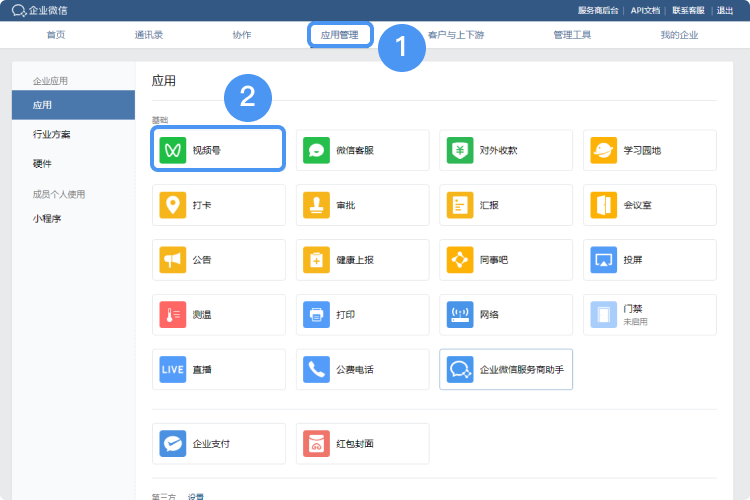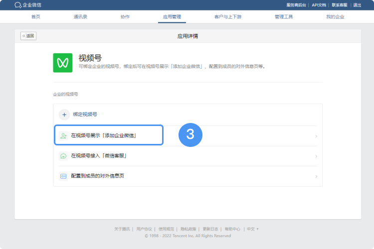 2、管理端:企業微信管理員登錄企業微信管理后臺,在“應用管理”——“應用”——“視頻號”——“在視頻號展示《添加企業微信》”中添加企業微信。
