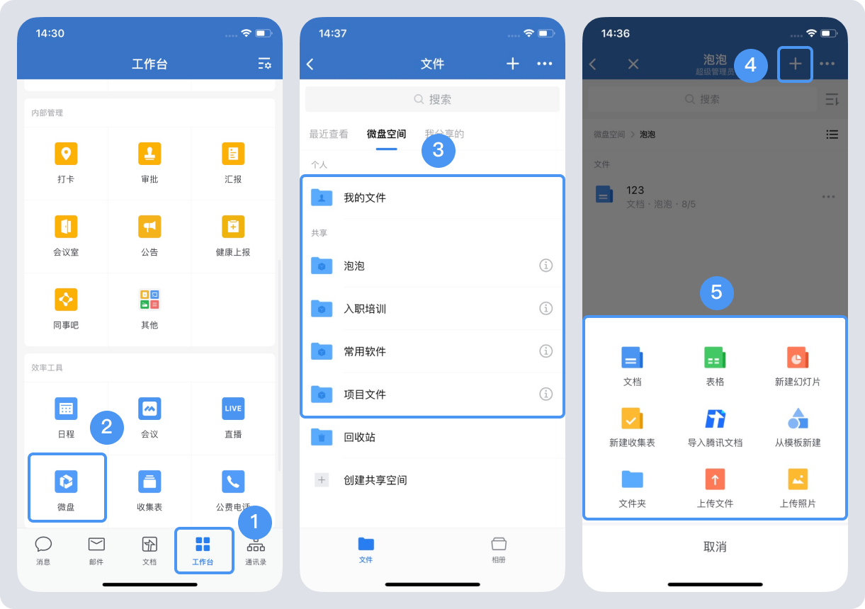 手機端:登錄手機端企業微信,在“工作臺”——“微盤”——“我的文件/任意一個共享空間文件”——“+”——選擇上傳文件或者上傳照片即可。