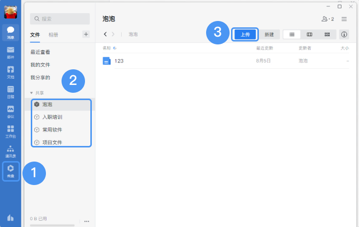 PC端:登錄PC端企業微信,選擇左側工具欄的“微盤”——“文件”——“共享”——“上傳”,就可以上傳相片或者對應的文件了。