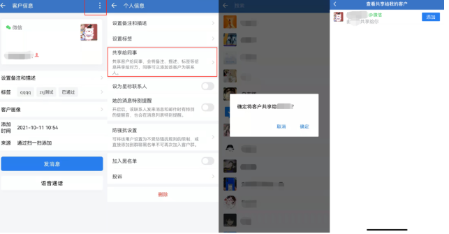 如果使用企業微信添加客戶,想要共享客戶給同事,企業員工可以在企微手機端點擊需共享客戶,點擊右上角的三個點圖標查看客戶信息,然后選擇【共享給同事】即可,同事點擊【添加】后就可以跟進服務客戶。