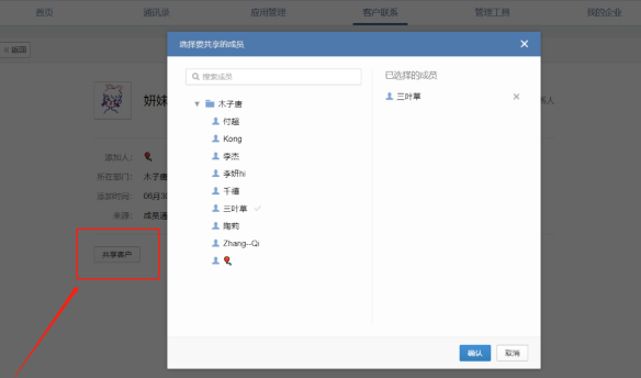 值得注意的一點是,共享的成員只有配置了使用客戶聯系功能,才可以實現共享。