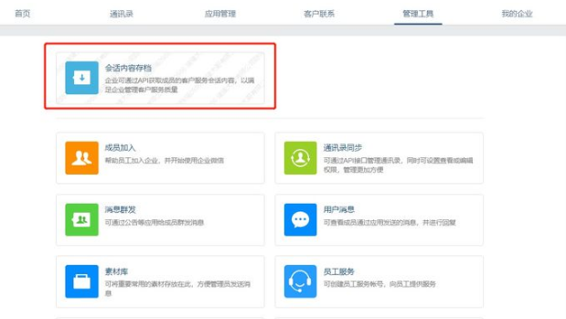 企業(yè)微信會話存檔在企業(yè)微信后臺的“管理工具”中就能查看此項功能,點擊“會話內(nèi)容存檔”,下載會話存檔確認函,填寫好各種信息,蓋章后上傳確認函,由企業(yè)微信官方進行審核即可,審核時間需要1到2個工作日。