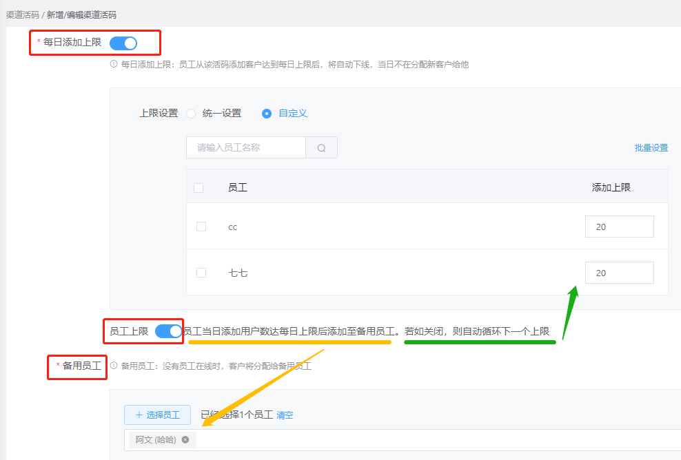 第三種情況,單個員工好友達到上限,這種情況也可以使用艾客的渠道活碼功能,當員工每日添加人數(shù)到達上限時,該員工活碼將自動下線。
