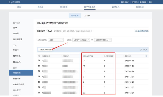 1、離職繼承:員工離職后,管理員登錄企業微信后臺,通過路徑【客戶上下游】—【客戶聯系】—【離職繼承】,可以將離職員工管理的客戶和客戶群一鍵分配給其他員工,保護好企業客戶資源。