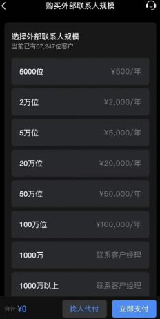 經過認證過的企業微信,一個好友每年0.1元。收費的對象是收費之日后新添加的好友,并且是在2000個免費好友之外的數額。具體的收費標準請查看下表: