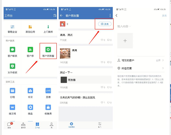 如果想發朋友圈給客戶,點擊【工作臺】—【客戶朋友圈】—【發表】,就能輸入想發送的圖片及內容。但是有一點值得注意,就是每個客戶每天最多只能接受三條你發送的朋友圈。