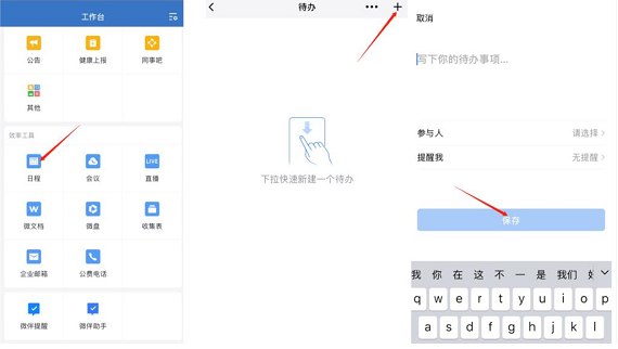 企業(yè)微信待辦事項(xiàng)提醒工具可提醒企業(yè)成員稍后處理某條消息,或?qū)α奶斐蓡T設(shè)置活動(dòng)提醒。而企業(yè)微信代辦事項(xiàng)提醒功能設(shè)置起來也很簡(jiǎn)單,只需要點(diǎn)進(jìn)企業(yè)微信,找到【工作臺(tái)】—【日程】,然后點(diǎn)擊右上角的“+”號(hào)就可以創(chuàng)建代辦,創(chuàng)建完成后就可以在設(shè)定好的時(shí)間收到待辦事項(xiàng)的提醒。