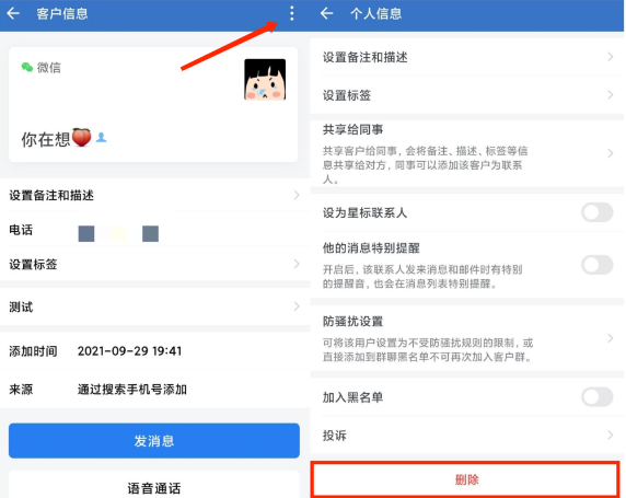 外部聯系人作為企業的重要資源,不要輕易刪除,如果已經確定要刪除好友,只要點擊客戶頭像,進入客戶消息頁面,然后點擊右上角的三個點,在個人信息界面選中刪除客戶即可。