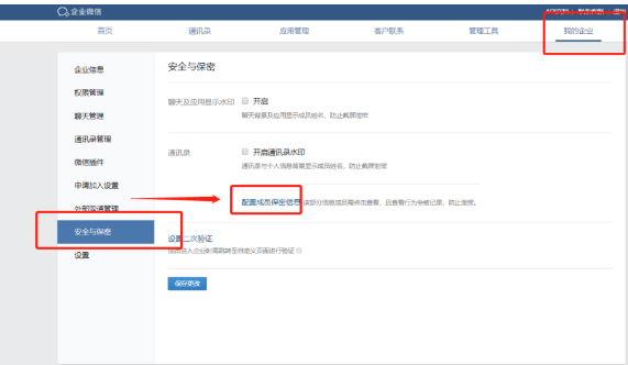 為了更好的保護企業信息的安全,我們可以登錄企微后臺進行成員保密信息設置,打開【我的企業】—【安全與保密】—點擊【配置成員保密信息】進行設置,設置后成員查看信息都可以有記錄。