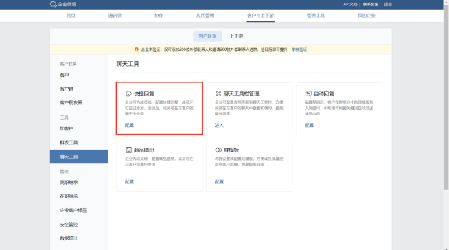 一、進入企微后臺設置:管理員在【客戶與上下游】—【客戶聯系】—【聊天工具】中,就能配置快捷回復。