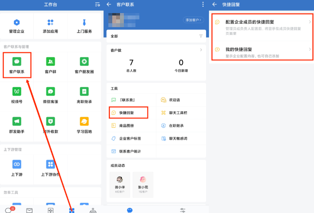 二、在移動端/PC端設置:管理員可在【工作臺】—【客戶聯系】—【快捷回復】中,就能為員工創建快捷回復。員工也能根據個人需要,創建個人快捷回復。