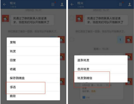如果想要將企業(yè)微信文件轉(zhuǎn)發(fā)到微信中,我們需要在企業(yè)微信手機(jī)端的聊天窗口中長(zhǎng)按想發(fā)送的文件,然后在彈出的窗口選擇多選,再選擇左下角的轉(zhuǎn)發(fā),這時(shí)就能看到把企業(yè)微信文件轉(zhuǎn)發(fā)到微信的選項(xiàng)了。