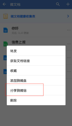 企業(yè)微信文件能轉(zhuǎn)發(fā)到微信,那企業(yè)微信微文檔中的文件能發(fā)送到微信嗎?其實(shí)微文檔也能發(fā)送到個(gè)人微信,我們從【工作臺(tái)】進(jìn)入【微文檔】界面后,只要長(zhǎng)按需要發(fā)送的文檔即可看到分享到微信的選項(xiàng)。