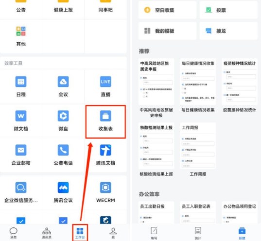 想使用企業微信做調查問卷,能使用企業微信收集表功能。可以在【工作臺】—【效率工具】中找到【收集表】應用,點進去在【新建】一欄就能看到企業微信提供的一些常用表格模板,如每日健康情況收集、活動滿意度調查、會員信息登記等。不想用現成的模板的話,還能選擇【空白收集】,自己創建新表格。