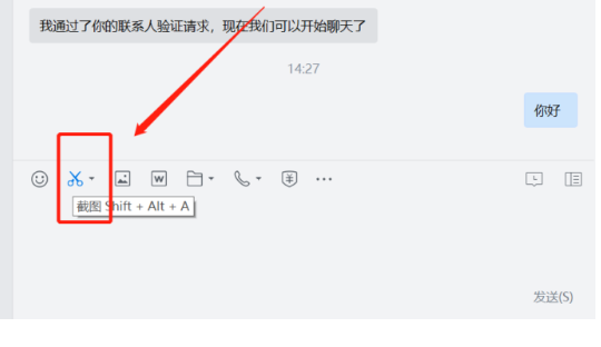 企業(yè)微信有截圖功能,在前臺和對方溝通界面,打開對話框,在輸入框上的功能欄里,看到的剪刀標識,就是截圖功能。