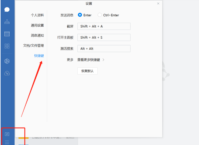 在企業(yè)微信前臺頁面,最左側(cè)欄的最下方,有三條杠,點擊它打開,就有關(guān)于快捷鍵的設(shè)置了。根據(jù)自己的習(xí)慣自定義設(shè)置快捷鍵字母組合。