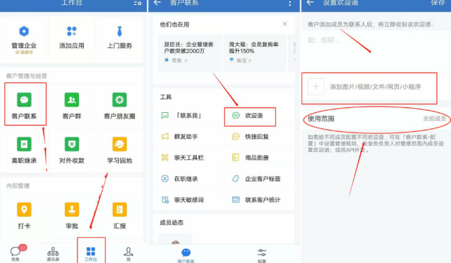 管理員在【工作臺】—【客戶聯系】—【歡迎語】中添加歡迎語內容,歡迎語中能添加含公司信息或者產品信息的圖片、視頻、文件、小程序或網頁等。