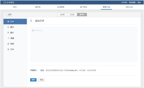 當我們進入企業微信管理后臺找到“素材庫”,點擊進入可以編輯好內容,設置好可使用的員工,即可點擊保存,方便自己或其他人下次使用。