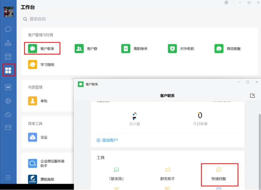 企業員工也可以在移動端添加回復話術,員工可以在企業微信工作臺中,找到“客戶聯系”,再選擇“快捷回復”,就可以進行添加自己的個人話術了。
