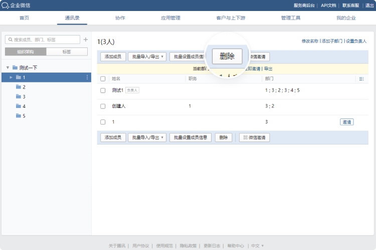 當該離職成員忘記退出企業微信時,可以由企業微信管理員在企業微信管理端操作,讓該離職成員被動退出企業微信。企業微信管理員直接在管理后臺的“通訊錄”中,找到該離職成員,勾選該成員后進行刪除即可。