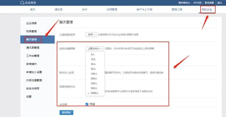 內(nèi)部群修改人數(shù)上限路徑:“我的企業(yè)”——“聊天管理”——“成員創(chuàng)建群聊”——選擇2000人即可。