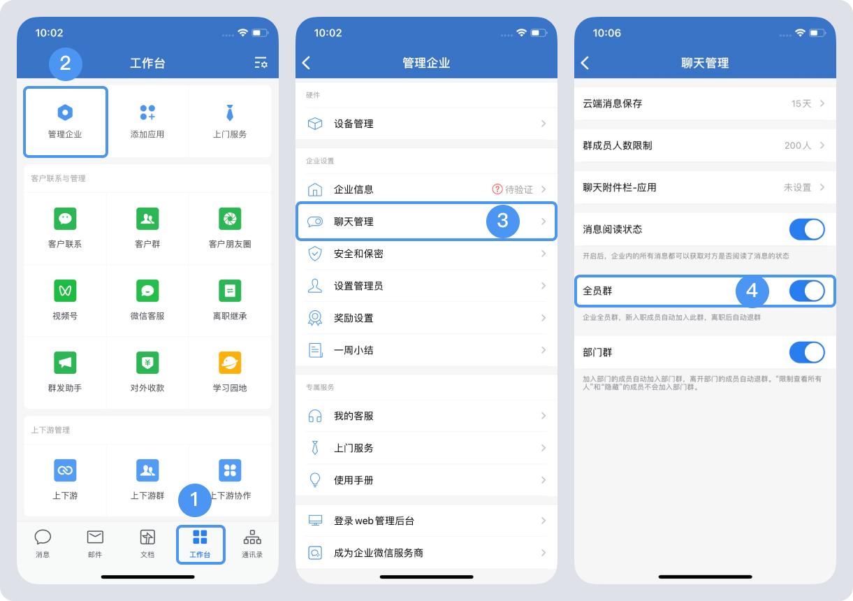 而如果企業(yè)不想使用全員群,那么可以關(guān)閉群聊。關(guān)閉全員群之后可以看見該群聊,但是無法在里面發(fā)言。企業(yè)微信管理員只需要在手機(jī)端就可以進(jìn)行操作了:“工作臺”——“管理企業(yè)”——“聊天管理”——關(guān)閉“全員群”,即可。