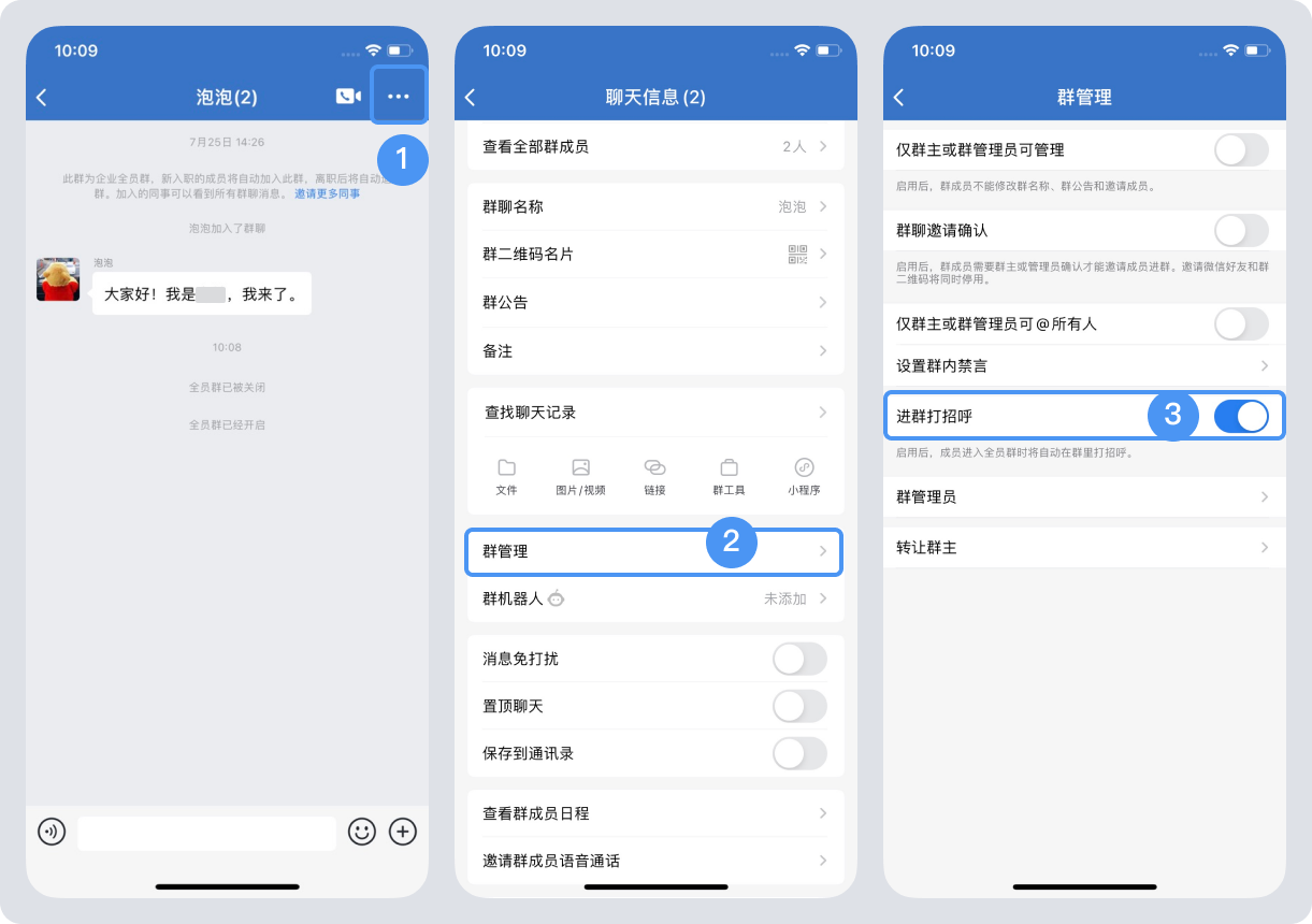 全員群群主可以開啟“進(jìn)群打招呼”功能,這樣新加入全員群的企業(yè)成員,一加入群聊就會自動出現(xiàn)打招呼的內(nèi)容。文案就是固定的內(nèi)容“大家好!我是XX,我來了。”