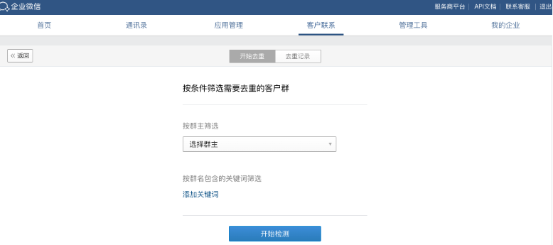 企業微信管理員登錄企業微信管理后臺,在“客戶聯系”——“群成員去重”——“開始去重”——“選擇群主”——“開始檢測”,系統就會檢測出重復添加社群的客戶,并且做有效去重處理。同時在企業微信管理端,還可以查看去重記錄。