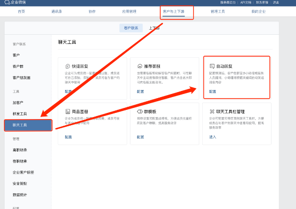 首先登錄企業微信管理后臺,選擇【客戶與上下游】—【聊天工具】—【自動回復】,點擊下方配置即可進行自動回復規則的創建。
