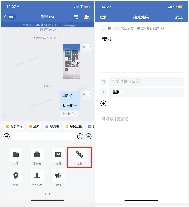 手機端企業微信群接龍方法:進入想要接龍的社群群聊頁面,在輸入框底下有“接龍”的圖標,點擊它就可以進行接龍相關信息的填寫了。