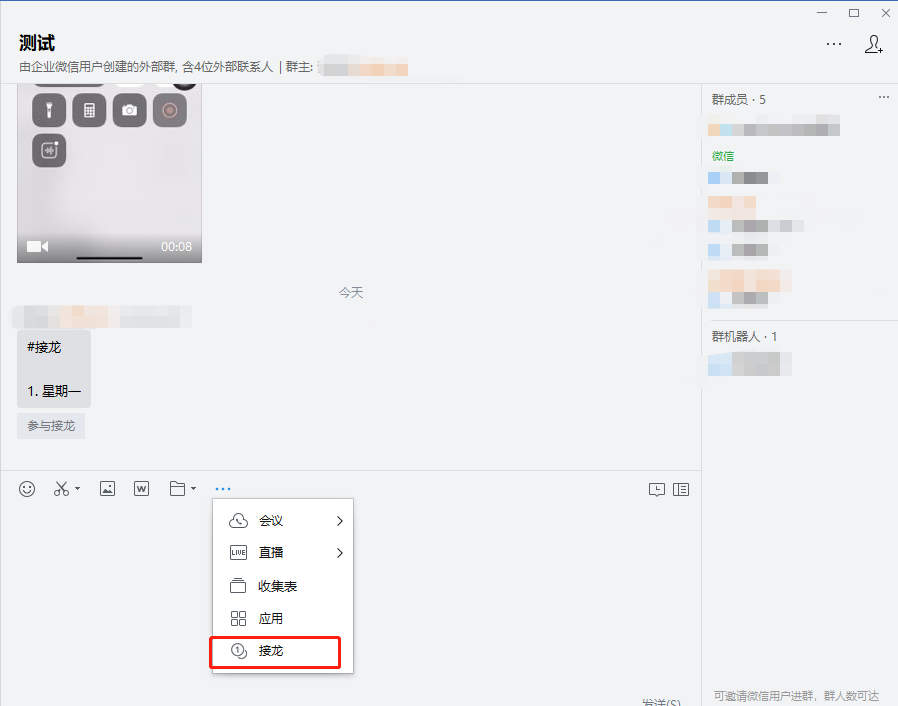 網頁版企業微信群接龍方法:進入群聊頁面,在輸入框上方有個小三點“...”,點開它,會有相關的“接龍”標識,點擊接龍就能進行接龍內容的填寫了。