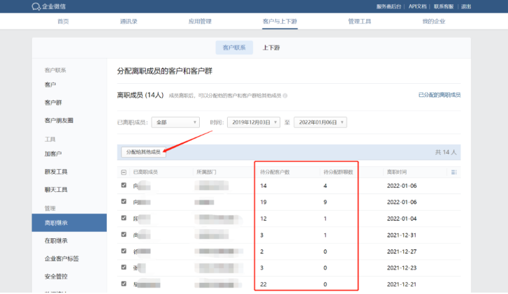 首先說說離職繼承功能,在員工離職后,管理員能在企業微信后臺的【客戶上下游】—【客戶聯系】—【離職繼承】中,把離職員工手上跟進的客戶分配給企業其他在職人員。