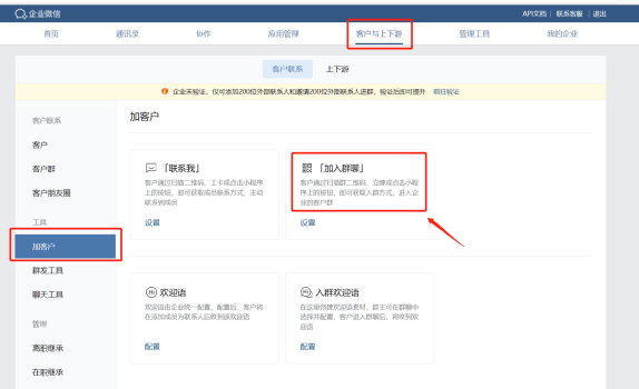 如果是企業管理員想生成群活碼,除了上述方式,還能在電腦端登錄企微管理后臺,點擊進入【客戶與上下游】—【加客戶】—【加入群聊】即可生成群活碼。