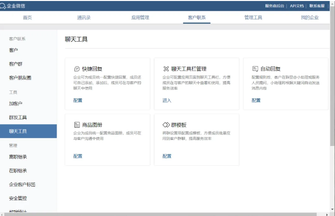 配置路徑:【企業(yè)微信管理后臺】—【客戶聯(lián)系】—【聊天工具】—【自動回復(fù)】。超級管理員需在管理后臺【客戶聯(lián)系】中新建【自動回復(fù)】功能,業(yè)務(wù)負(fù)責(zé)人不支持設(shè)置這個回復(fù)規(guī)則。