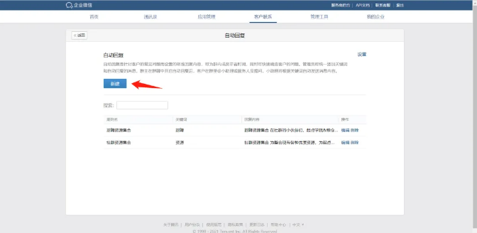 那我們怎么設(shè)置企業(yè)微信自動回復(fù)?首先我們可以點擊自動回復(fù)下的規(guī)則,再點擊新建,最后輸入關(guān)鍵詞內(nèi)容和回復(fù)內(nèi)容即可設(shè)置完成。
