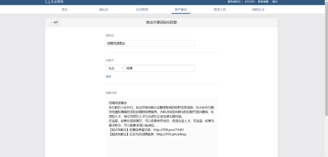 在關(guān)鍵詞選項還能設(shè)置包含或完全匹配,比如關(guān)鍵詞為“招聘”,在包含選項下,客戶發(fā)送“可在群里發(fā)招聘信息嗎”就會觸發(fā)自動回復(fù),在完全匹配選項下,客戶必須發(fā)送“招聘”兩個詞才可以觸發(fā)自動回復(fù)。