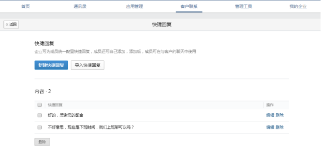 如果想規范員工的溝通話術,可以使用企業微信的快捷回復功能。管理員能在企微管理后臺【客戶聯系】—【配置】—【快捷回復】中新建或導入已整理好的話術,讓員工統一使用。