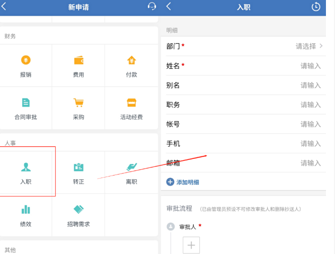 員工只需要打開企業微信,找到【工作臺】就能在【審批】界面提交入職申請。這時,我們要謹慎填寫自己的個人信息,選擇對應的審批人,方便上級審批。