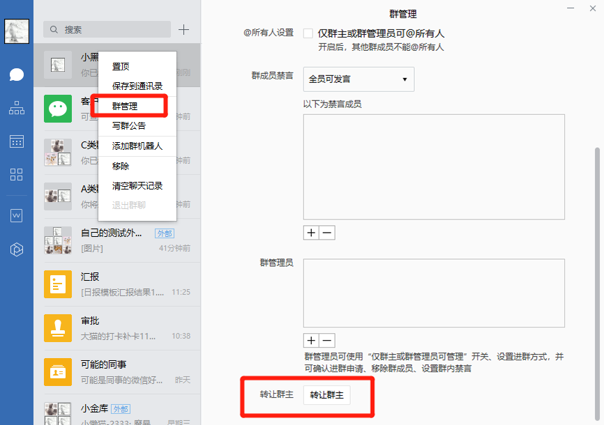 (2)電腦端:點擊企業微信客戶端前臺,在左側會話列表中,右鍵“群聊”,點擊“群管理”,選擇“轉讓群主”即可。
