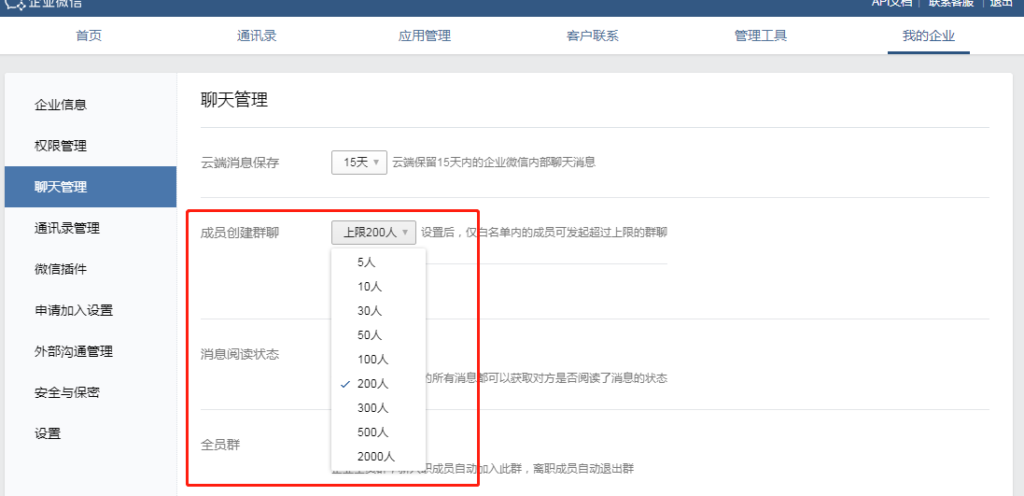 值得注意的是,如果想要拓展內(nèi)部群的人數(shù)上限,可以在“我的企業(yè)”——“聊天管理”——“成員創(chuàng)建群聊”修改群聊人數(shù)上限,上限人數(shù)可以到2000人。