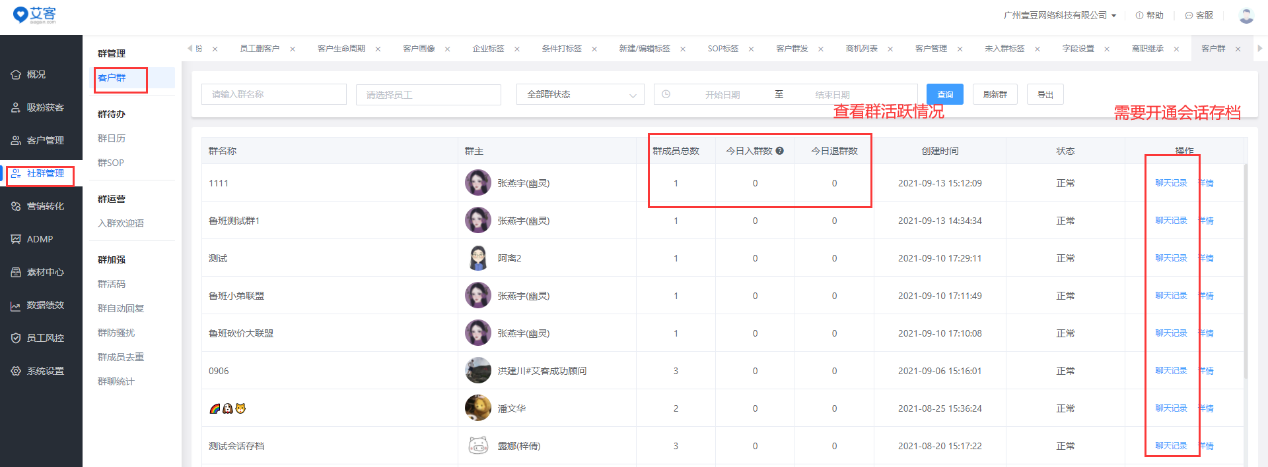 當(dāng)企業(yè)建立的外部群出現(xiàn)群組過多不好管理的情況下,可以使用艾客SCRM系統(tǒng)的客戶群功能,它可以把員工創(chuàng)建的所有外部群,集成在艾客管理端統(tǒng)一管理。管理員可以篩選查詢每一個員工有哪些群,并可以查看到這些群的人數(shù)、群主、以及具體的群成員組成。