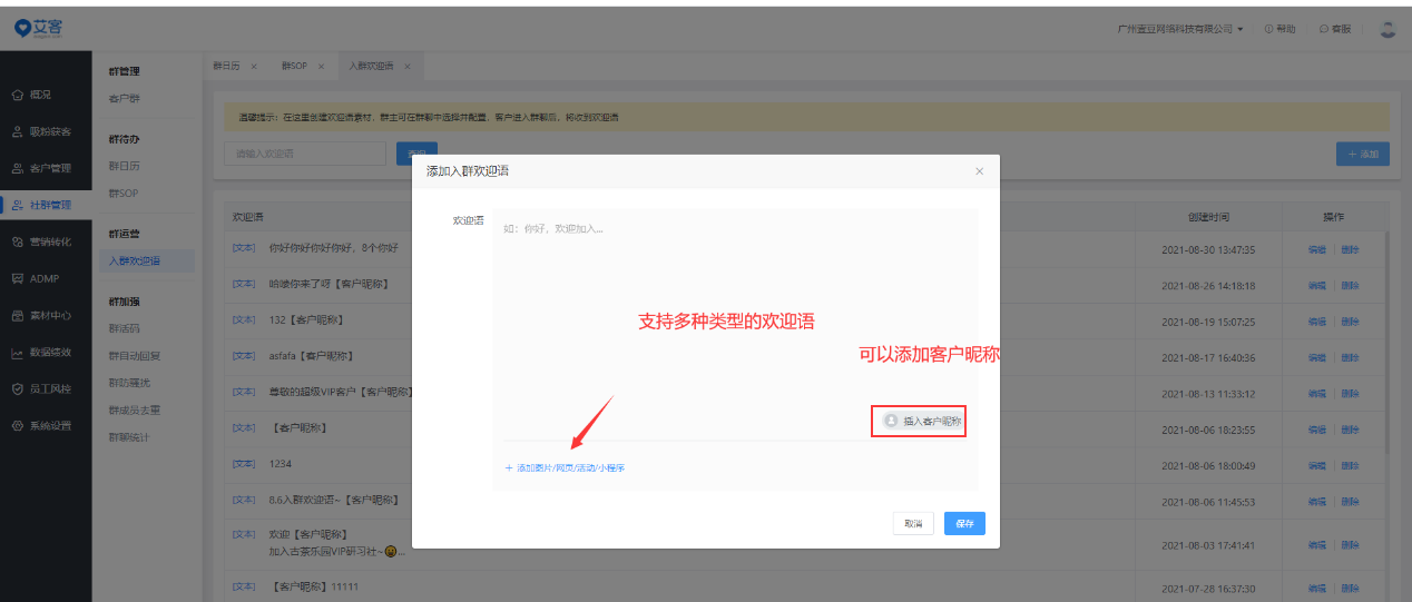 企業如果想要更省事的入群歡迎語設置,可以利用艾客SCRM系統的入群歡迎語。在企業微信管家后臺創建歡迎語素材后,群主可在手機端-群聊中選擇并配置,客戶進入群聊后將收到歡迎語。歡迎語支持多種方式展現,文字、圖片、活動、網頁、小程序等,都可以進行設置。