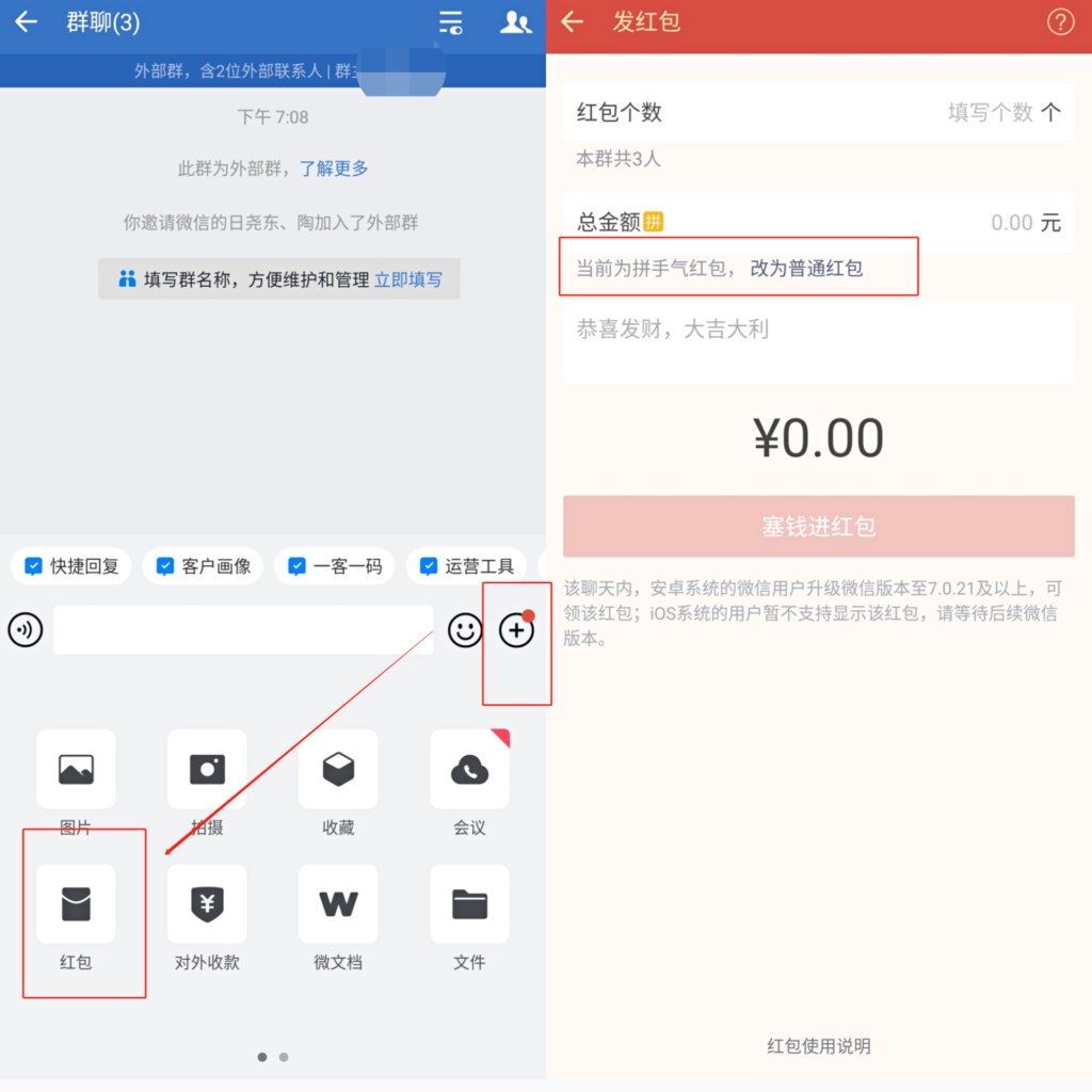 以給客戶(hù)群發(fā)紅包為例:只要打開(kāi)聊天會(huì)話頁(yè)面,在輸入框下方就能看到紅包標(biāo)識(shí),點(diǎn)擊它就可以輸入對(duì)應(yīng)的金額,填寫(xiě)好紅包個(gè)數(shù),還可以設(shè)置成拼手氣或者普通紅包,之后塞錢(qián)進(jìn)紅包就可以在群內(nèi)發(fā)紅包了。