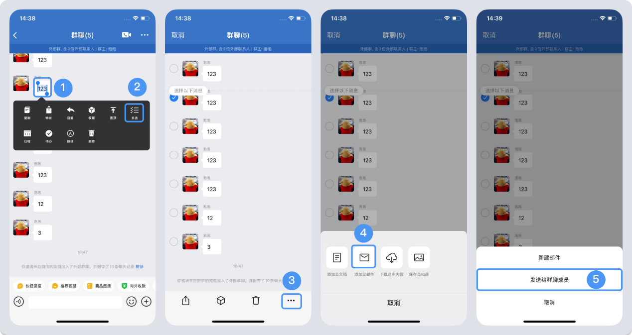 在手機端中,企業成員先找到需要發送的的郵件內容,長按“多選”——右下角三個點“...”——“添加至郵件”——“發送給群聊成員”即可。點擊發送后還可以選擇對應的接收人員,發送人在客戶端需要綁定郵箱,并且可以看見對方的郵箱才可以發送成功。