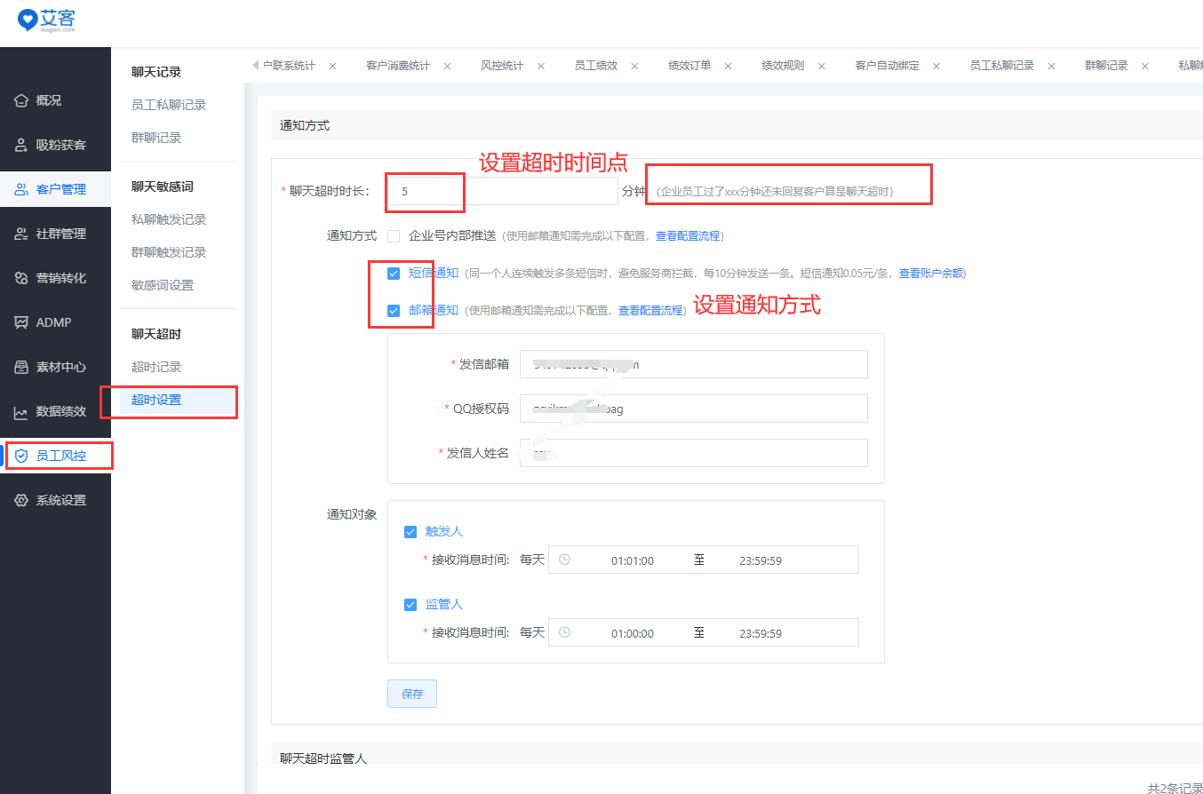 除了以上情況需要發郵件,企業使用艾客SCRM系統的敏感詞設置功能也需要用到郵箱郵件通知。當企業員工在與好友溝通的過程中,觸發了敏感詞,系統會自動以短信或者郵箱的方式告知當位員工,讓其員工有改正錯誤的機會。