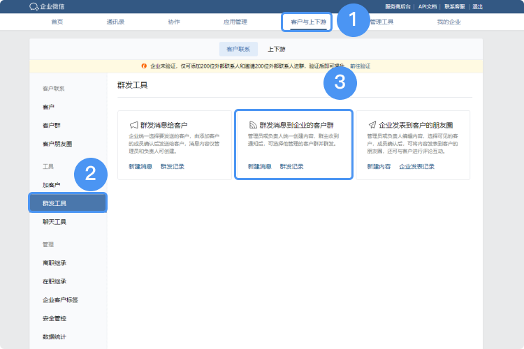 PC端群發步驟:企業微信管理員登錄企業微信后臺,“客戶與上下游”——“客戶聯系”——“群發工具”——“群發消息到企業的客戶群”。