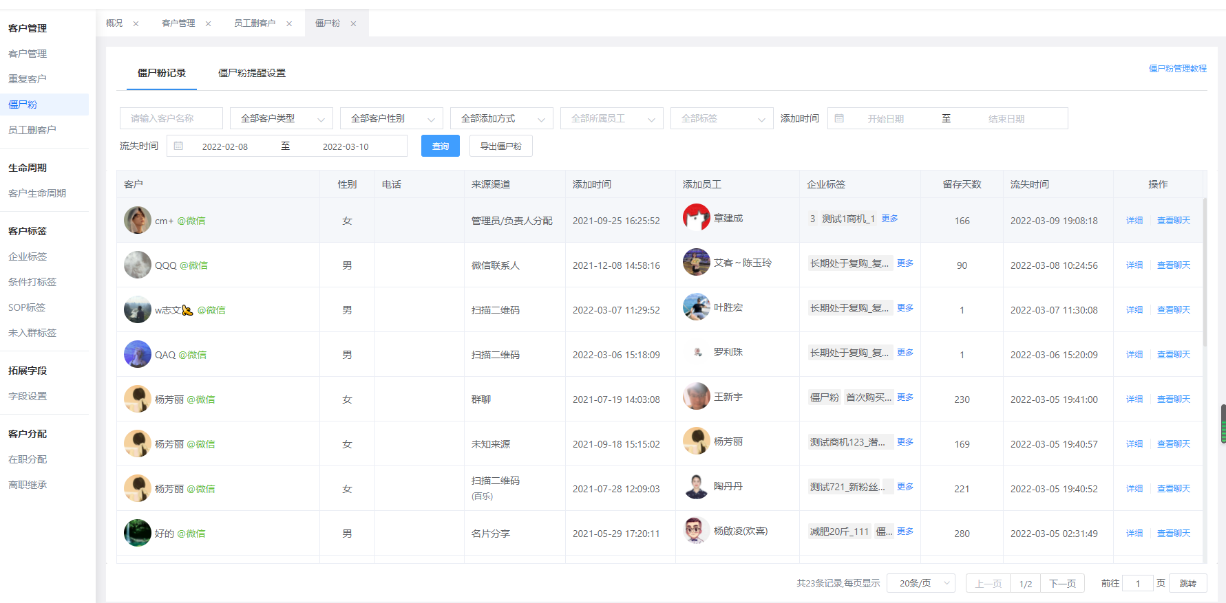 所以,客戶流失我們只能通過給客戶發送信息來判斷是否被客戶刪除了,但是,對于大部分企業來說,客戶數量龐大,無法通過一個個給客戶發送信息來判斷是否被刪除,這樣的話,太浪費時間,效率低,那有什么辦法能夠幫助企業查看客戶有沒有刪除了員工?