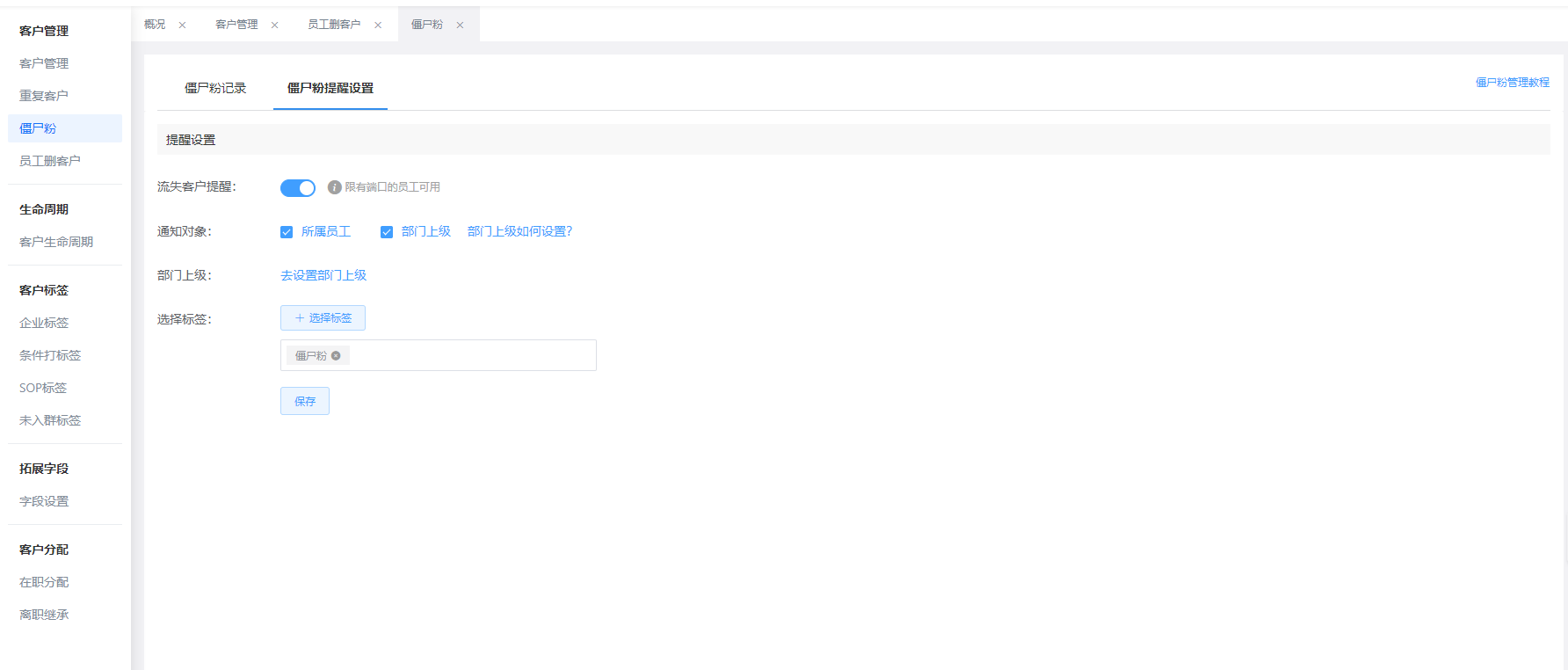 艾客scrm有僵尸粉提醒功能,當企業員工被客戶刪除之后,艾客scrm后臺僵尸粉記錄表會產生記錄,能夠實時所屬員工及部門管理員會收到通知提醒,管理員也可以在后臺查看所有流失客戶詳情。